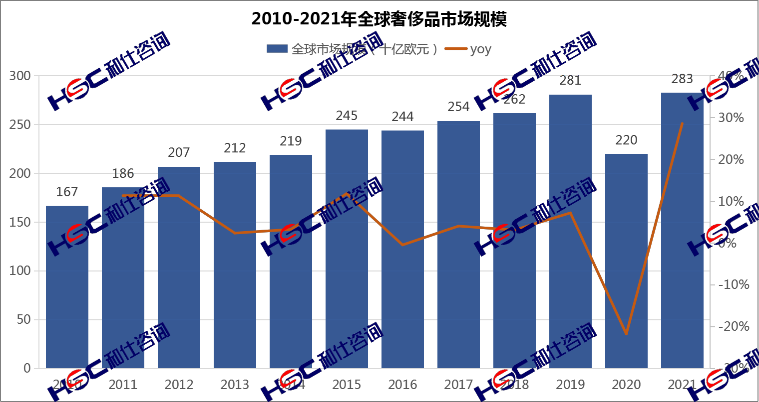 全球范圍內中國境內奢侈品市場高速增長。根據貝恩調查數據顯示,2020年受疫情影響全球奢侈品銷售額回落至2170億歐元/-23%,預計2021年全球奢侈品銷售額有大幅回升,達到2830億歐元/+29%,按固定匯率計算同比2019年增長4%。中國消費者的總購買量受疫情影響預估下降30-35%,但由于出境受限更多消費回流至國內,中國人購買奢侈品的消費渠道發生改變,境內消費奢侈品的比例由32%提升至70-75%,導致中國境內的奢侈品消費金額有大幅提升,2021年發生在中國境內的奢侈品消費金額達到約4255億人民幣/+35%,按區域分在全球奢侈品市場中的比例達到21%,較2019年占比提高10pct。