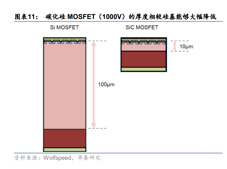 SiC MOSFET 較 IGBT 可同時具備耐高壓、低損耗和高頻三大優勢。1)碳化硅擊穿電場強度是硅的十余倍,使得碳化硅器件耐高壓特性顯著高于同等硅器件。2)碳化硅具有 3 倍于硅的禁帶寬度,使得 SiC MOSFET 泄漏電流較硅基 IGBT 大幅減少,降低導電損耗。同時, SiC MOSFET 屬于單極器件,不存在拖尾電流,且較高的載流子遷移率減少了開關時間,開關損耗因此得以降低。根據 Rohm 的研究,相同規格的碳化硅 MOSFET 較硅基 IGBT 的總能量損耗可大大減低 73%。3)涵蓋 MOSFET 自身特點,較 IGBT 具備高頻優勢。此外,據 Wolfspeed 研究顯示,相同規格的碳化硅基 MOSFET 與硅基 MOSFET 相比,其尺寸可 大幅減少至原來的 1/10。