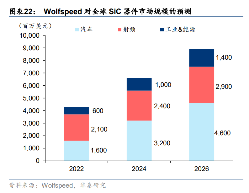 (1)碳化硅器件方面,Wolfspeed 預計 2022年市場規模將達到 43 億美元,2024 年進一 步增長至 66 億美元,并于 2026 年突破 89 億美元。碳化硅器件市場增長驅動力主要來自電動汽車、射頻、工業及能源領域,其中,在電動汽車大勢所驅背景下,碳化硅材料在 400V 和 800V 充電架構中的優勢日益凸顯,Wolfspeed 預計 2026年汽車器件將占據超 50%的市場規模,2023-2026 年 CAGR 達 30%;此外,隨成本下降,碳化硅器件在工業市場的應用將更加廣泛,Wolfspeed 預計遠期有望創造超 400 億美元市場空間。