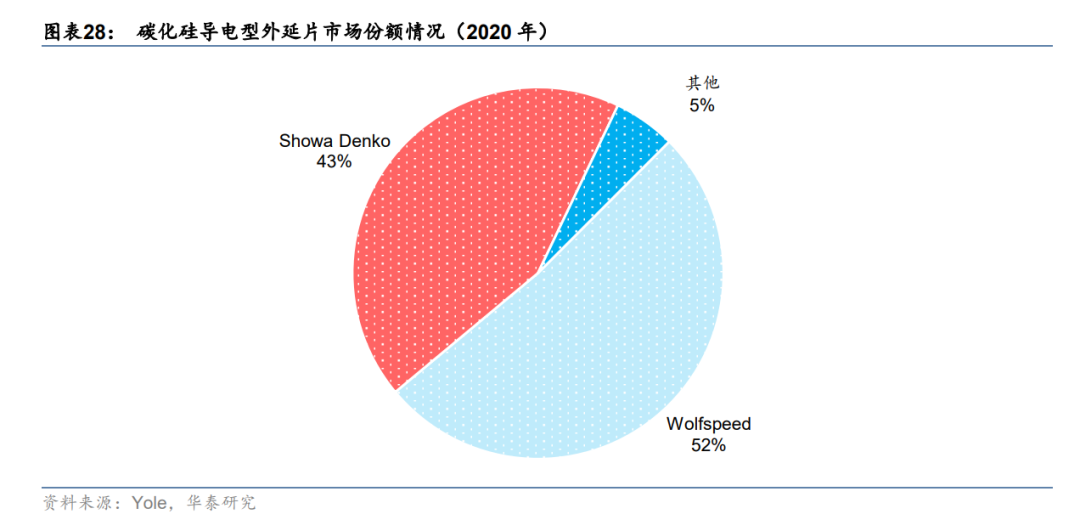 Wolfspeed、Showa Denko 雙寡頭壟斷碳化硅外延片市場。碳化硅外延片屬于行業產業鏈中間環節,參與廠商多為 IDM 公司,Industry Research 測算 2020 年全球碳化硅外延片市 場規模約為 1.72 億美元。據 Yole 數據,2020 年 Wolfspeed 與 Showa Denko 分別占據碳化硅導電型外延片市場52%和43%的市場份額,合計高達95%,具備顯著的制備技術優勢。其他碳化硅外延供應商包括Ⅱ-Ⅵ、Norstel、羅姆、三菱電機、英飛凌,占據市場較小份額。國內碳化硅外延片主要制造廠商有瀚天天成和東莞天域半導體,兩者均已具備供應 4-6 英 寸外延片實力,待產能進一步釋放。