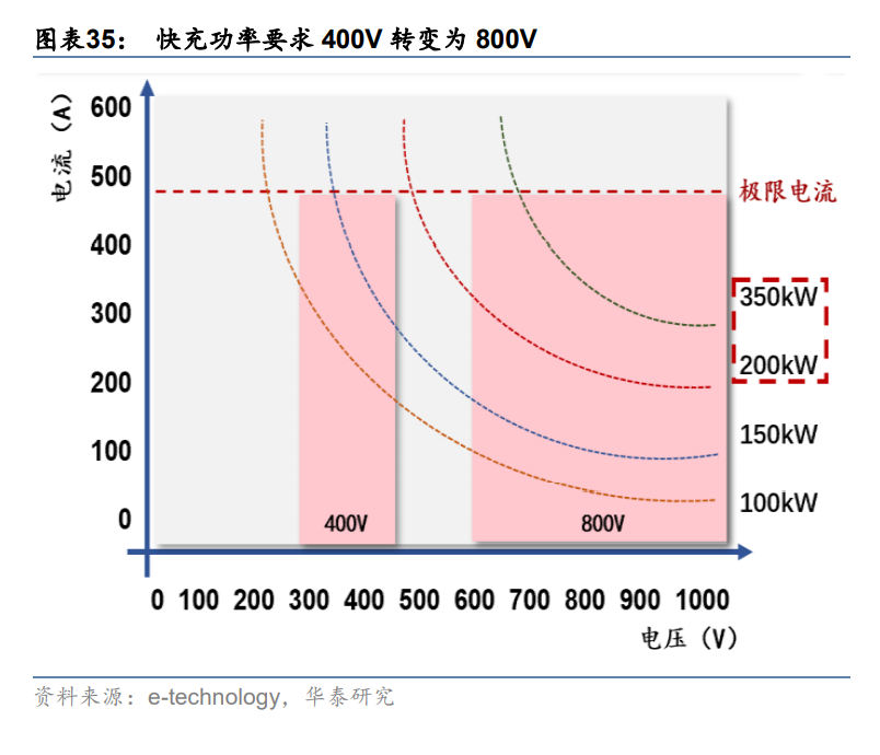 充電焦慮逐漸成為當前電動車產業化關鍵的問題,800V 架構是解決充電焦慮的主流方案。電動車普及過程中主要面臨續航和充電兩大問題。續航里程目前已不是最大阻礙,根據蔚來、特斯拉、小鵬等的官網,主流品牌電動車續航里程約在 500 公里左右,即將推出的蔚來 ET7、理想 X01 等預計續航里程超 800 公里。對于提升充電效率,方案包括換電及大功 率快充。由于各品牌各車型電池差異,換電站推廣較為依賴車企自建,普適性低且成本高。大功率充電包括大電流和高電壓兩種方案,大電流方案代表企業為特斯拉,根據焦耳定律, 該方案將顯著增加充電過程中的熱量,需要更粗的線束同時對系統散熱要求更高。此外,根據新出行測評,特斯拉大電流 V3 超充樁在大部分時間內并不能達到最大功率充電。