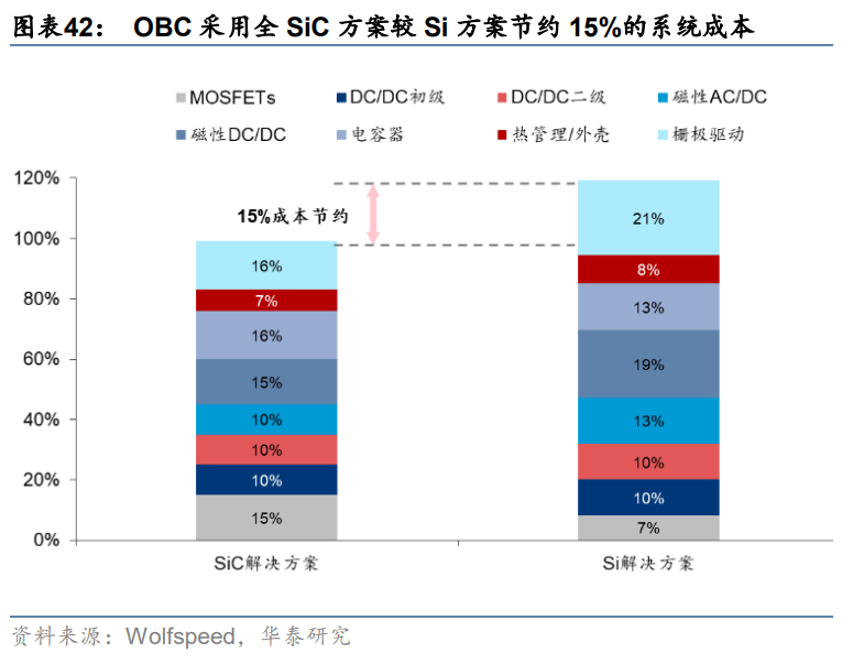 全 SiC MOSFET 方案降低 OBC 系統尺寸、重量和成本,同時提高運行效率。根據Wolfspeed 的研究,采用全 SiC MOSFET 方案的 22 kW 雙向 OBC,可較 Si 方案實現功率器件和柵極 驅動數量都減少 30%以上,且開關頻率提高一倍以上,實現系統輕量化和整體運行效率提 升。SiC 系統在 3kW/L 的功率密度下可實現 97%的峰值系統效率,而 Si OBC 僅可在 2kW/L 的功率密度下實現 95%的效率。同時,進一步拆分成本,由于 SiC 器件的性能可減少 DC/DC 模塊中所需大量的柵極驅動和磁性元件。因此,盡管相比單個 Si 基二極管和功率晶體管, SiC 基功率器件的成本更高,但整體全 SiC 方案的 OBC 成本可節約 15%左右。