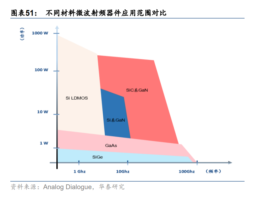 5G 發展推動碳化硅基氮化鎵器件需求增長,市場空間廣闊。微波射頻器件中功率放大器直接決定移動終端和基站無線通訊距離、信號質量等關鍵參數,5G 通訊高頻、高速、高功率特點對其性能有更高要求。以碳化硅為襯底的氮化鎵射頻器件同時具備碳化硅高導熱性能和氮化鎵高頻段下大功率射頻輸出優勢,在功率放大器上的應用可滿足 5G 通訊對高頻性能、高功率處理能力要求。當前 5G 新建基站仍使用 LDMOS 功率放大器,但隨5G 技術進一步發展,MIMO 基站建立需使用氮化鎵功率放大器,氮化鎵射頻器件在功率放大器中滲透率將持續提升。
