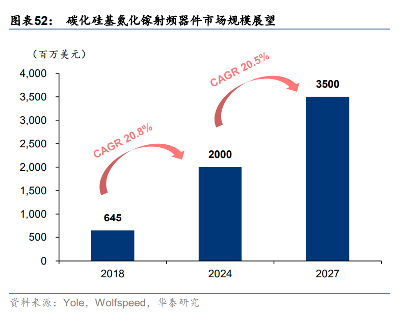 據 Yole 和 Wolfspeed 預測,2024年碳化硅基氮化鎵功率器件市場有望突破 20 億美元,2027 年進一步增長至 35 億美元。根據我們的預測,受益 5G 通訊快速發展,通訊頻段向高頻遷移,基站和通信設備需要支持高頻性能的 PA,碳化硅基氮化鎵射頻器件相比硅基 LDMOS 和 GaAs 的優勢將逐步凸顯,我們測算 2020年全球碳化硅射頻器件市場規模為 8.92 億美元,預計到 2025 年將增長至 21.21 億美元,對應 CAGR 為 18.9%,和 Yole 和 Wolfspeed 預測基本一致。