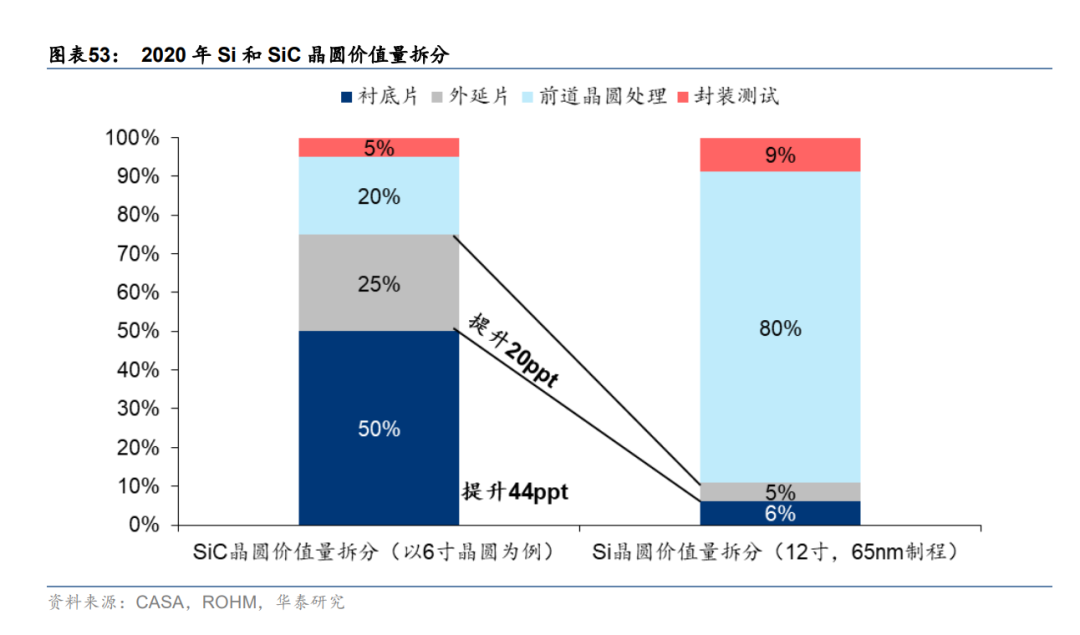 相比于 Si,SiC 襯底和外延為制造產業鏈核心環節,合計價值量占比超 60%。在傳統硅基器件制造過程中,需要在硅片基礎上進行氧化、涂層、曝光、光刻、刻蝕、清洗等多個前道處理步驟,從而產生更高附加值。SiC 材料則僅用于分立器件制造,其前端工藝難度不大,而襯底和外延需在高溫、高壓環境中生成,生長速度緩慢,為關鍵技術難點,占據產業鏈主要價值量。據 CASA Research 數據顯示,在傳統硅基器件中,硅片前道處理附加價值量達到 80%,襯底和外延環節僅占 11%;而在碳化硅器件的成本構成中,襯底和外延占比分別為 50%和 25%,合計達到 75%,為產業鏈中價值量最高環節。此外,襯底和外延質量對器件性能優劣起至關重要作用,提升其良率為碳化硅器件制備主要攻克目標。